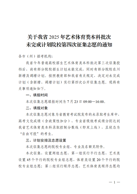 關于四川省2025年藝術體育類本科批次未完成計劃院校第四次征集志愿的通知