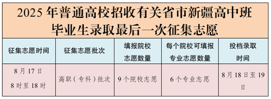 根據(jù)有關(guān)省市新疆高中班畢業(yè)生錄取工作日程安排,2025年普通高校招收有關(guān)省市新疆高中班畢業(yè)生錄取未完成計劃最后一次征集志愿及投檔錄取工作將于8月17日至19日進(jìn)行。