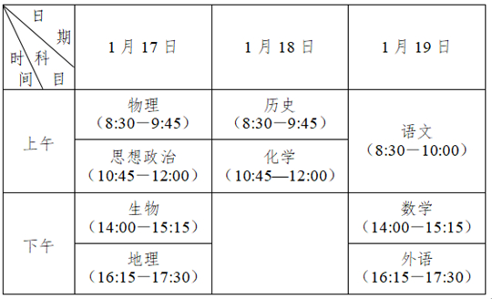 考試時間為2026年1月17日——19日。除語文科目考試時長為90分鐘外,其他各科均為75分鐘。具體安排如下: