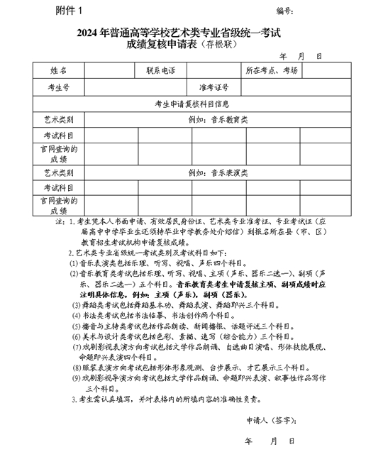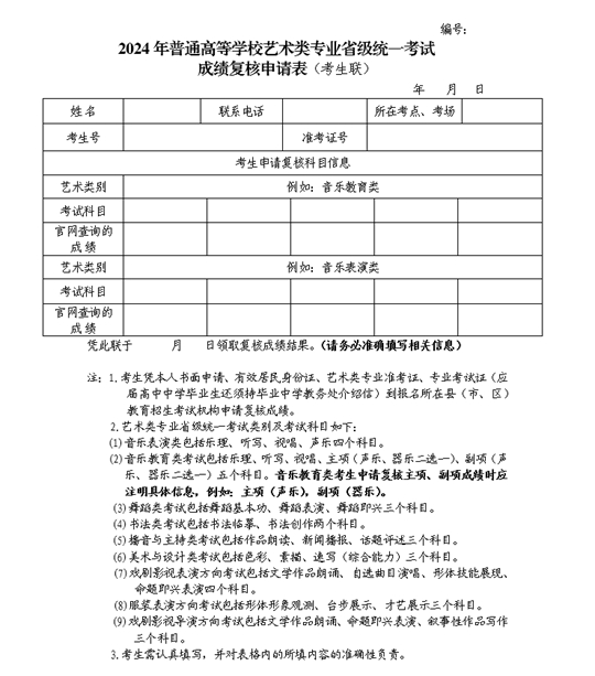 附件:1.2024年普通高等學(xué)校藝術(shù)類專業(yè)省級(jí)統(tǒng)一考試成績(jī)復(fù)核申請(qǐng)表
