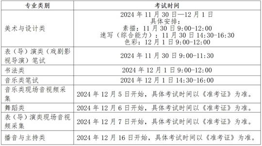 (2)藝術類專業省級統考筆試科目安排在2024年11月30日—12月1日進行,現場音視頻采集科目于2024年12月5日開始。