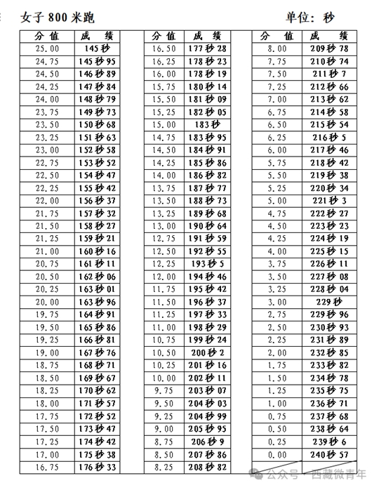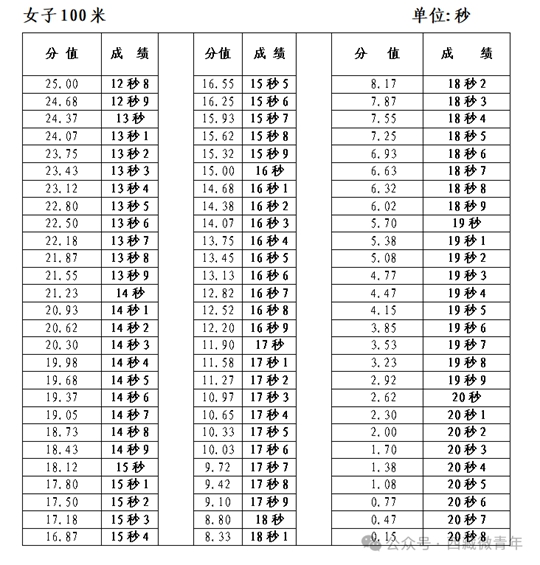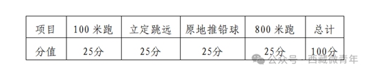 考試科目共有四項。分別是100米跑、立定跳遠、原地推鉛球、800米跑。