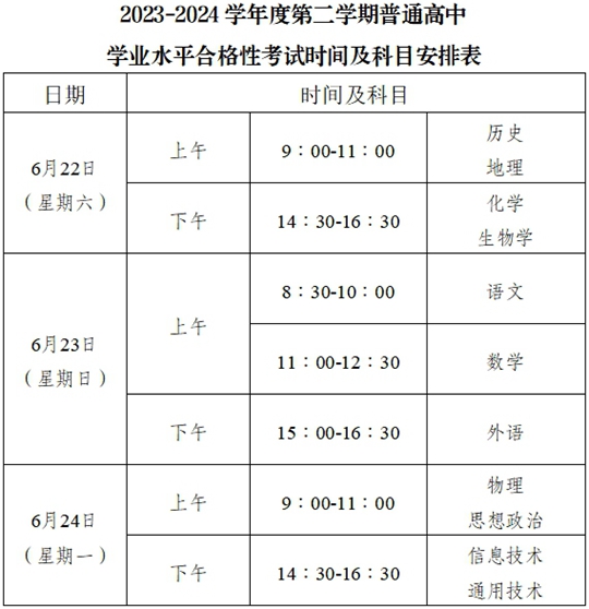 我市2023-2024學年度第二學期普通高中學業水平合格性考試將于2024年6月22日-24日進行。現將考試及報名有關安排公告如下: