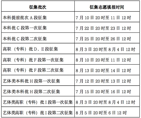 除本科批(B段)、藝術、體育類本科提前批(G段)等兩個批次不實行征集志愿外,其他批(段)次均實施征集志愿。