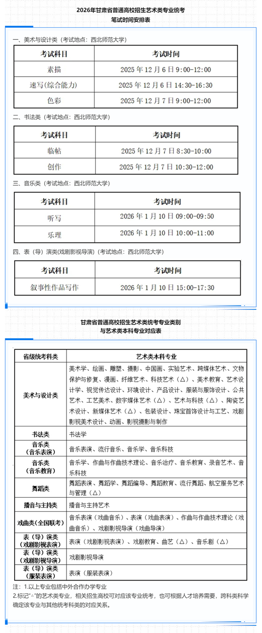 1.2026年甘肅省普通高校招生藝術類專業(yè)統(tǒng)考筆試時間安排表