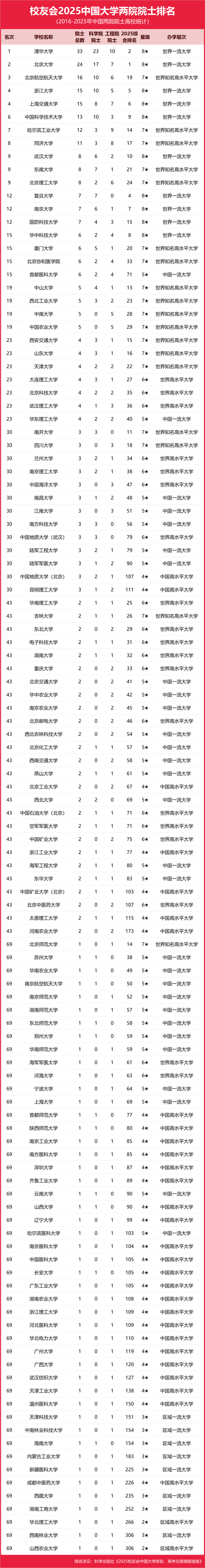 校友會中國大學排名基于“大平臺、大團隊、大項目、大成果、大校友”體系框架對中國高校辦學質量進行系統評價,至今已有23年的歷史,已成為具有廣泛社會影響力、公信力、參考價值與創新力的中國大學排名領先品牌。校友會2025中國大學兩院院士排名統計對象為2016-2025年中國高校申報并當選中國科學院和中國工程院院士的教師。