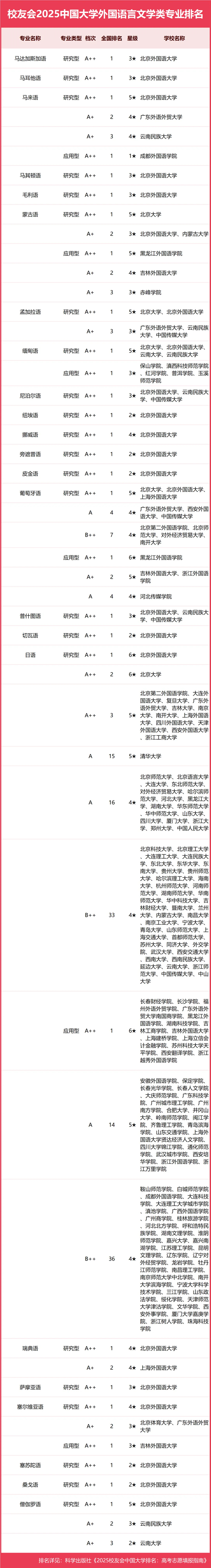 在2025中國大學爪哇語專業排名(研究型)中,北京外國語大學榮得2025中國二星級專業(2★),挺進中國區域高水平專業行列,勇奪冠軍。