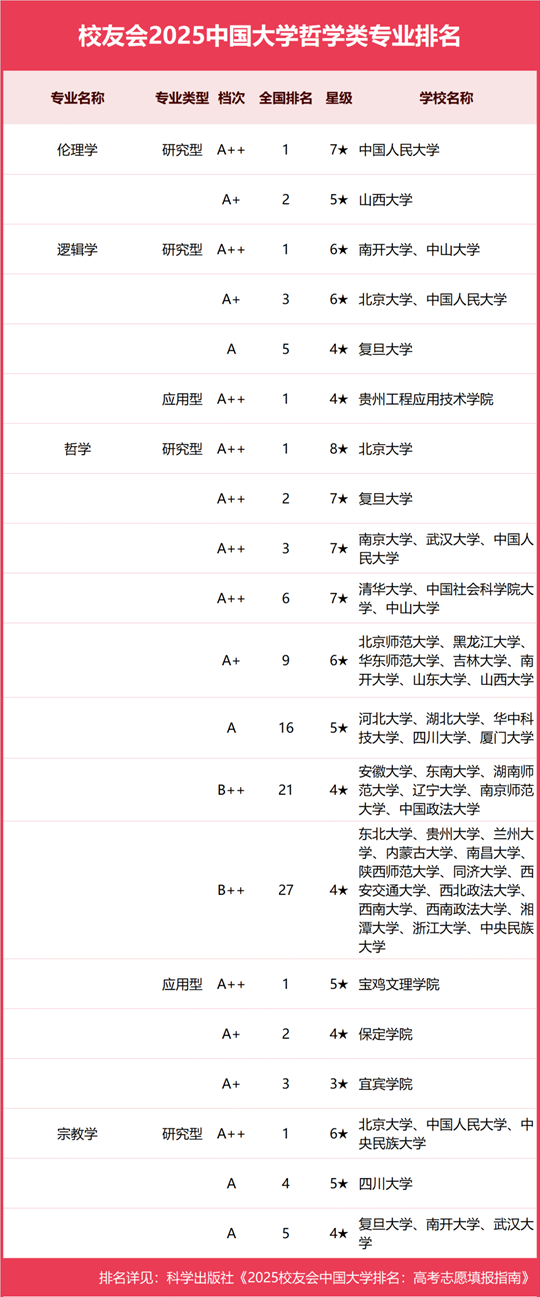 校友會2025中國大學哲學類專業排名(應用型)