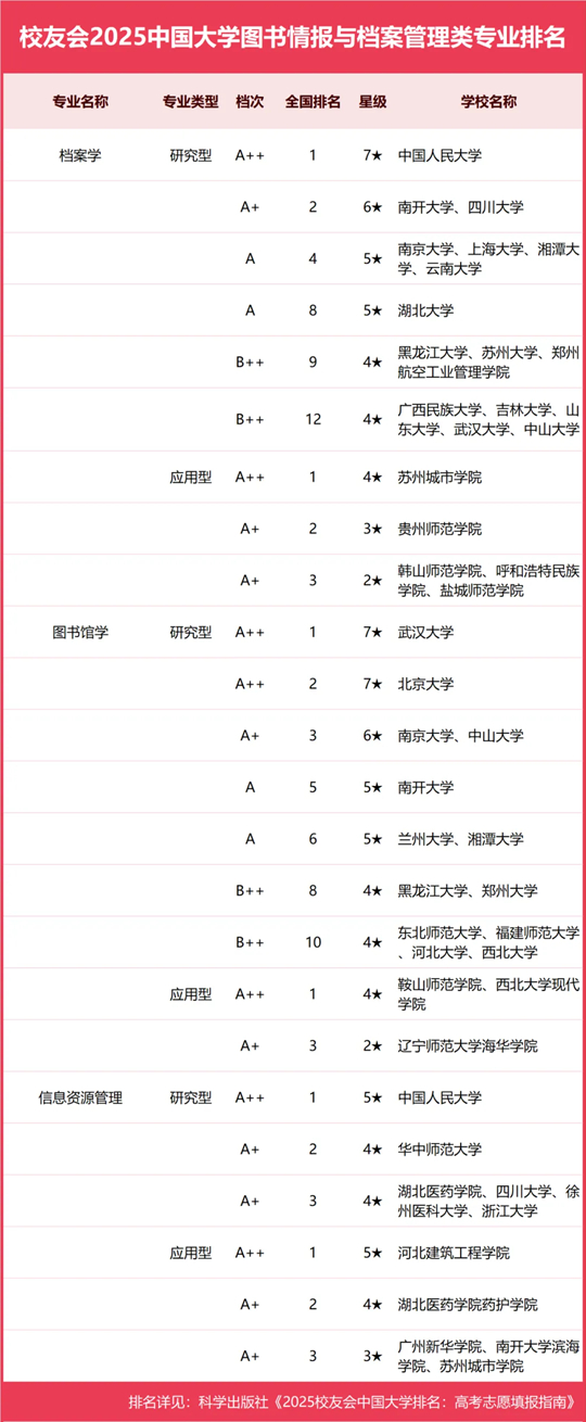 校友會2025中國大學圖書情報與檔案管理類專業排名(應用型)