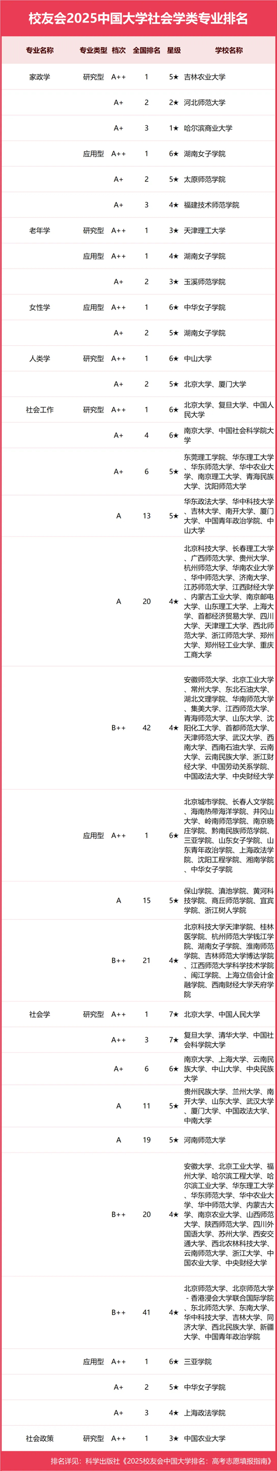 在2025中國大學社會學專業排名(研究型)中,北京大學、中國人民大學榮膺2025中國七星級專業(7★),進入世界知名高水平專業、中國頂尖專業行列,榮登第一。