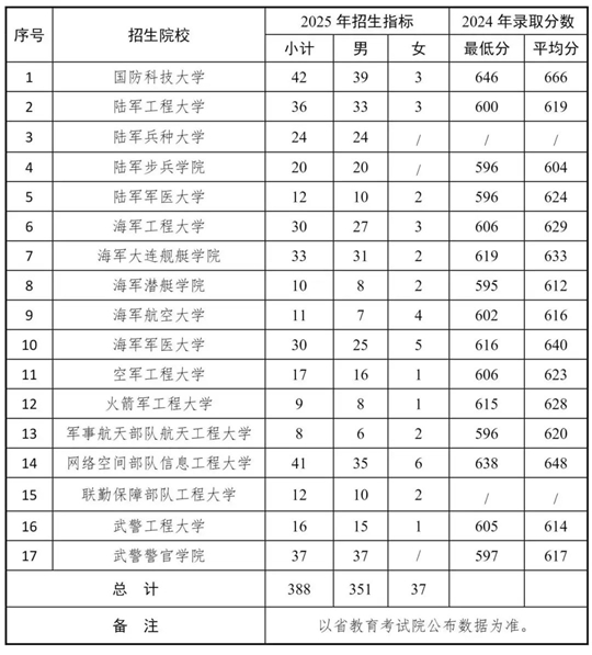 招生計劃:今年,國防科技大學、陸軍工程大學、陸軍兵種大學等17所軍隊院校在我省招生388人,其中男生351人、女生37人。具體專業招生計劃、選考科目及體格檢查標準等,在6月份省教育考試院編印的《2025年普通高校招生計劃》中統一公布。