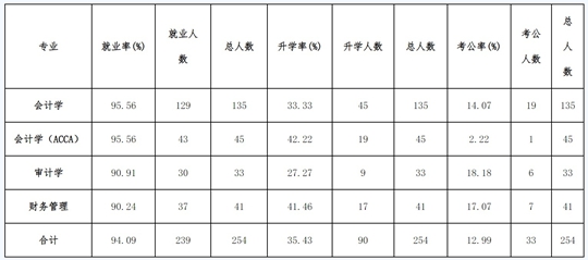 會計學專業(yè)畢業(yè)生總數(shù)為135人,就業(yè)人數(shù)129人,就業(yè)率為95.56%。升學人數(shù)45人,升學率為33.33%(其中7人出國)。簽約企業(yè)的84名學生中,9人就職于會計師事務所(其中,立信會計師事務所1人,天健會計師事務所5人,中匯會計師事務所3人),19人考取公務員及選調(diào)生,8人就職于農(nóng)行、工商銀行、國網(wǎng)、紹興市軌道交通集團有限公司、中國大地財產(chǎn)保險股份有限公司浙江分公司、浙江雷博人力資源開發(fā)有限公司等國企。