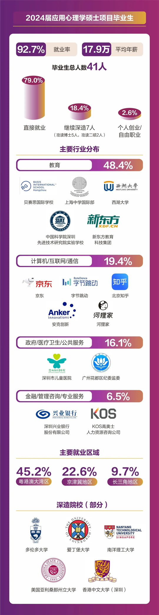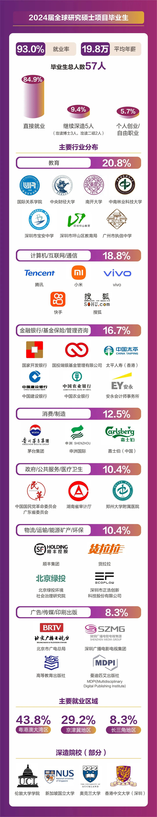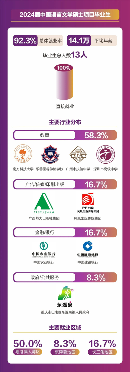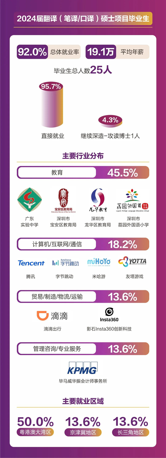 人文社科學院碩士畢業人數共計157人,分別來自翻譯(筆譯/口譯)、同聲傳譯、應用心理學、全球研究、中國語言文學等5個碩士項目。2024屆碩士畢業生總體就業率達到92.36%,平均年薪為18. 4萬元。其中86.2%畢業生選擇直接就業,畢業生就業行業分布廣泛,涵蓋了教育、計算機/互聯網/通信、貿易/消費/制造/營運、金融/銀行/證券/基金、政府/社會治理/公共服務、廣告/傳媒/印刷出版、管理咨詢/專業服務、能源礦產/石油化工/環保、醫藥生物/醫療衛生、物流/運輸等多個行業領域。就業地點主要集中在粵港澳大灣區、京津冀區以及長三角地區等一線城市及生活圈。11%的學生則選擇繼續深造,其中12人將在境內外知名院校攻讀博士學位。