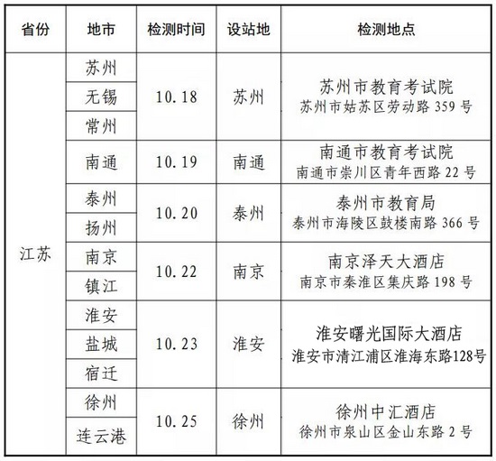 檢測一般于當天上午8:00開始,需半天左右,我省各地市檢測地點及日程安排如下: