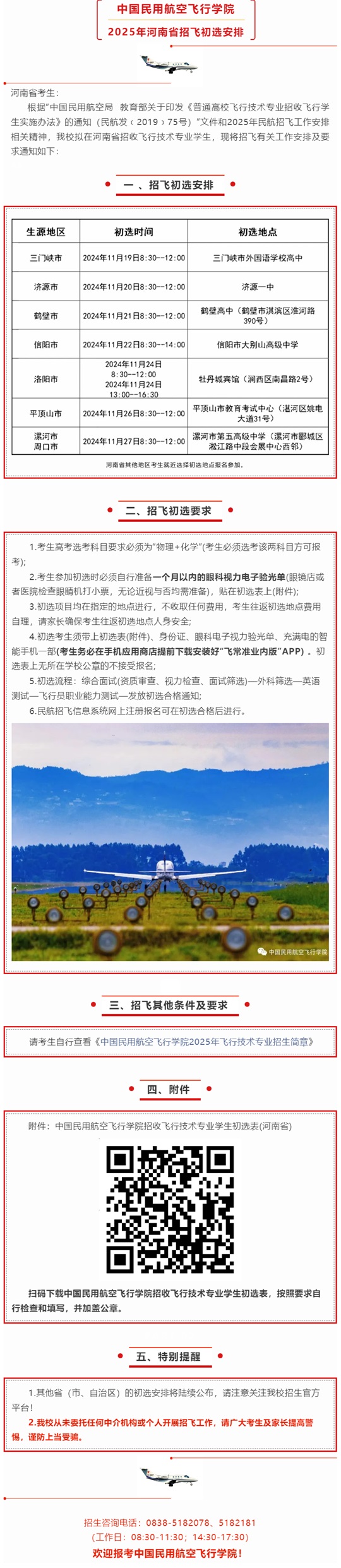 中國民用航空飛行學院2025年河南省招飛初選安排