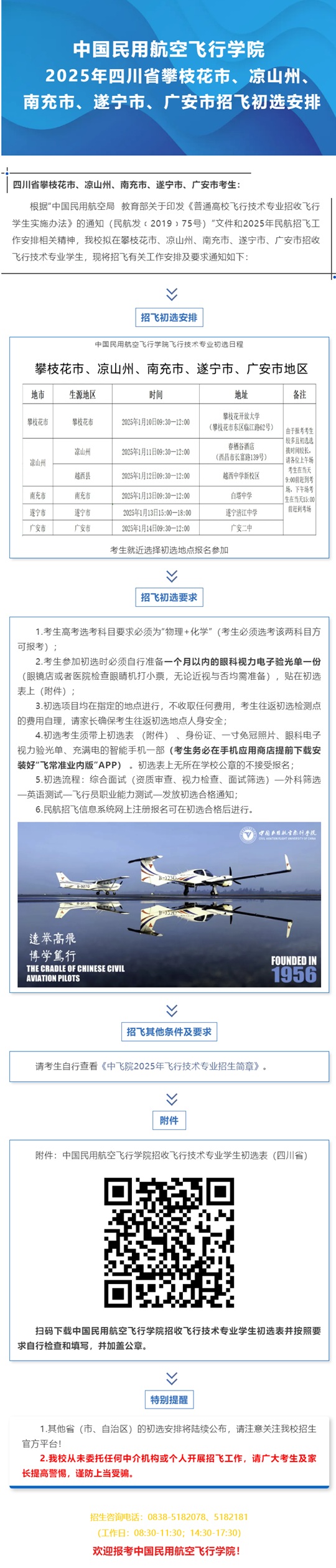 中國民用航空飛行學(xué)院2025年四川省攀枝花市、涼山州、南充市、遂寧市、廣安市招飛初選安排