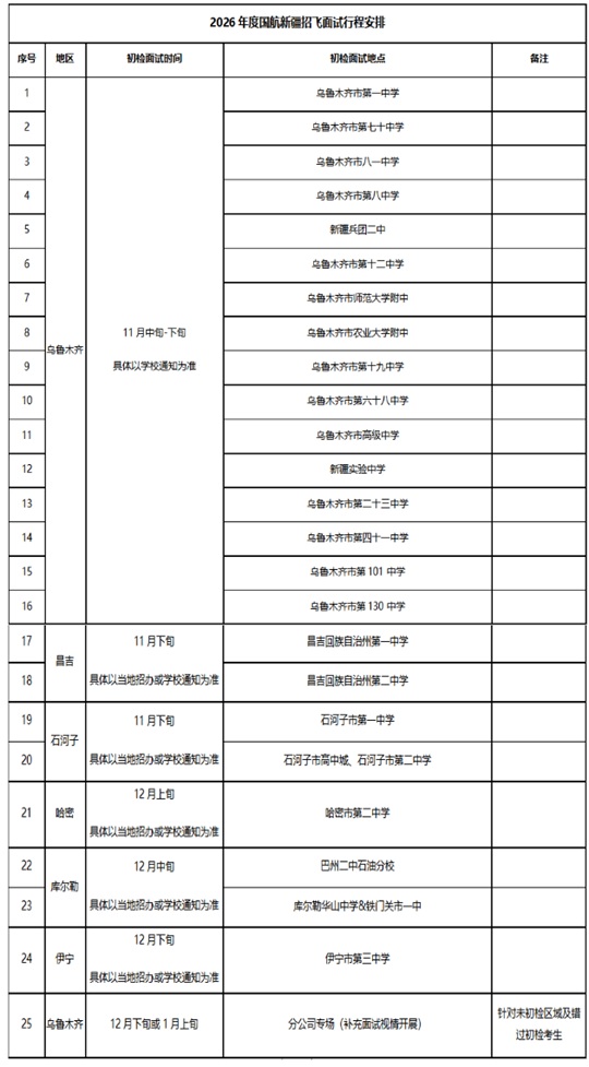 溫馨提示:初檢面試即將于2025年11月中旬陸續開展,以上安排為計劃,如有變動,由國航新疆分公司招飛辦公室與各地招生辦、學校協商后另行通知。為提升初檢面試效率,每天的初檢面試活動分為不同場次進行,請考生按照學校或短信通知的時間提前10分鐘到場。
