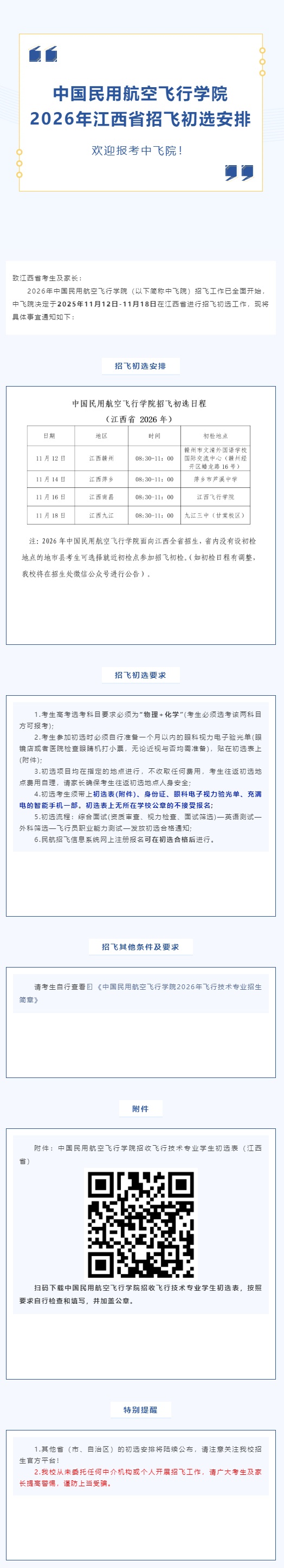 中國民用航空飛行學院2026年江西省招飛初選安排