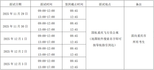 1.僅接受參加國航重慶地區線上初檢合格且在國航招飛管理平臺完成面試預約的考生參加面試,面試流程為:簽到(預約時間前15分鐘停止簽到)—身高體重復測—飛行職業能力傾向測試—英語能力測試—集中面試,每名考生考核及等候時間約為4小時,請考生合理安排出行計劃。