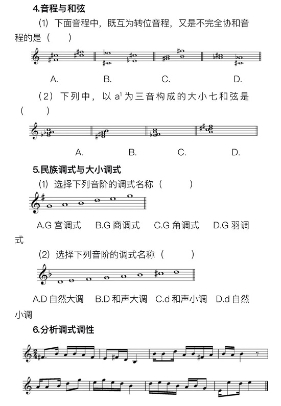 2.考試內(nèi)容:音與音高、音長與節(jié)奏、常用樂譜符號、音程與和弦、民族調(diào)式與大小調(diào)式。