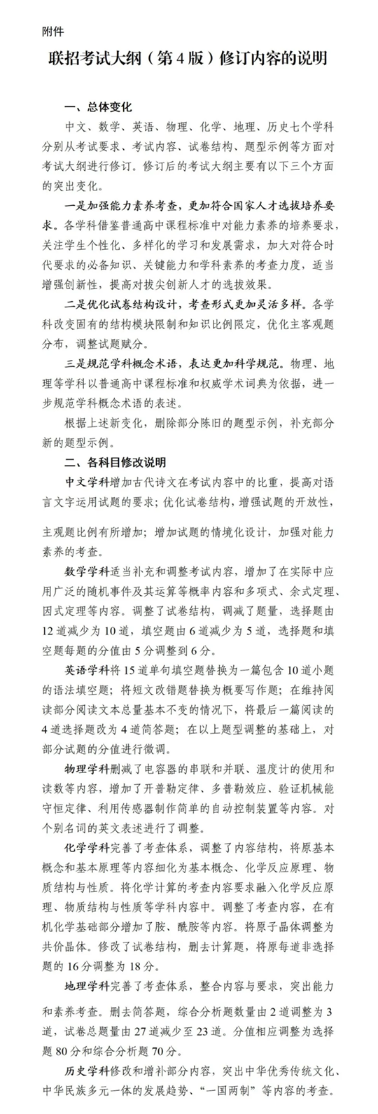 此次修訂在整體框架保持穩定的原則下,進一步加強能力素養考查,更好服務國家人才選拔培養;進一步優化試卷結構設計,考查更加靈活多樣;進一步規范學科概念術語,表達更加科學規范。各學科考試大綱主要修訂內容見附件。