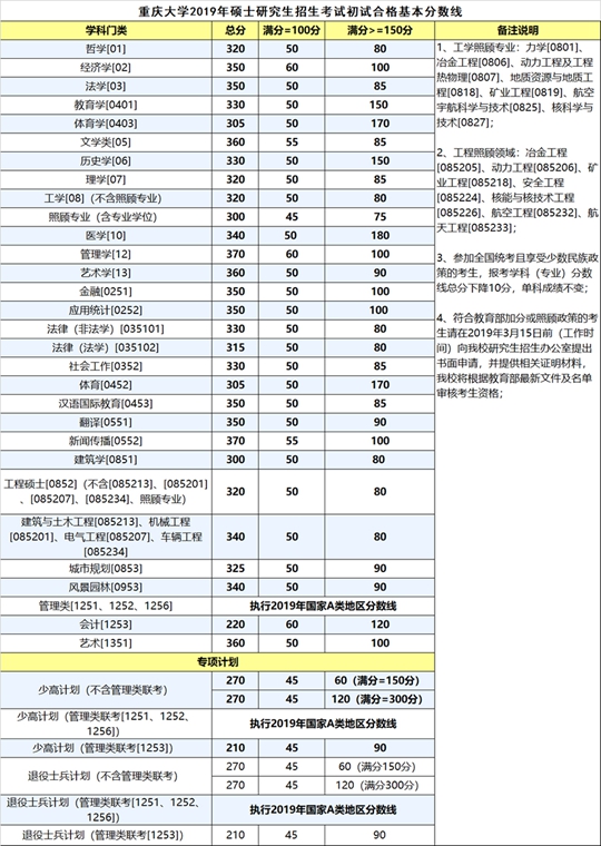 | 重慶大學2019年碩士研究生招生考試初試合格基本分數線 |