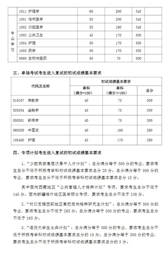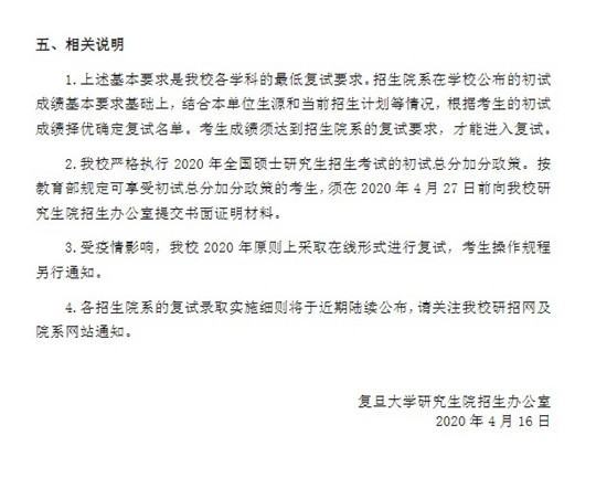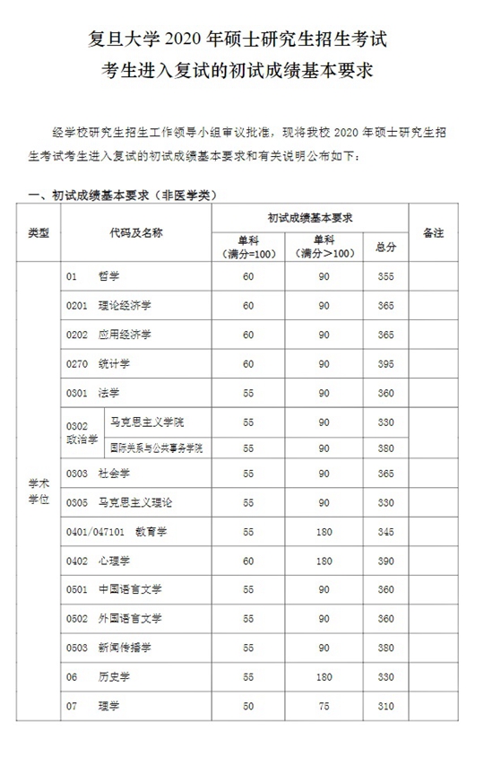 復(fù)旦大學(xué)2020年碩士研究生招生考試考生進(jìn)入復(fù)試的初試成績(jī)基本要求