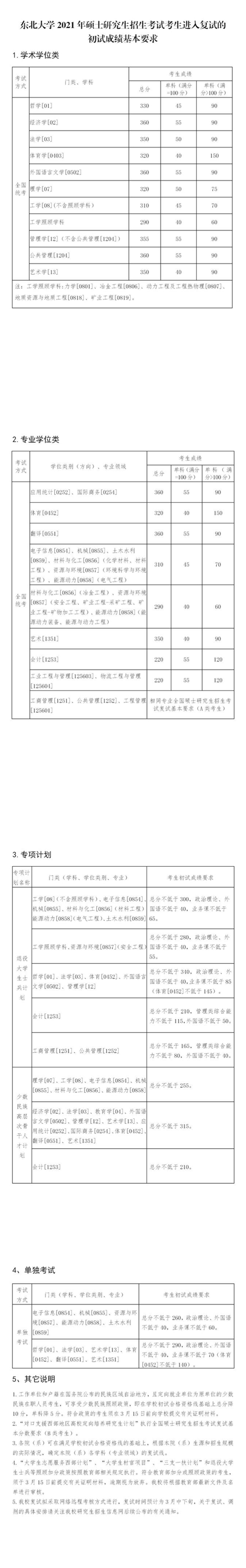東北大學2021年碩士研究生招生考試考生進入復試的初試成績基本要求