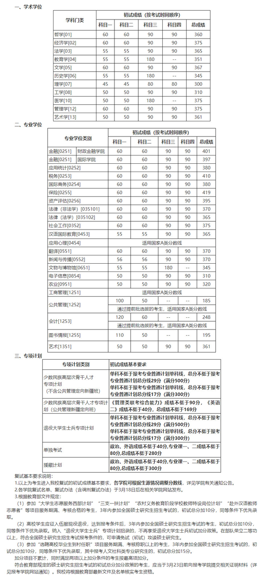 中國人民大學2022年碩士研究生招生考試考生進入復試的初試成績基本要求