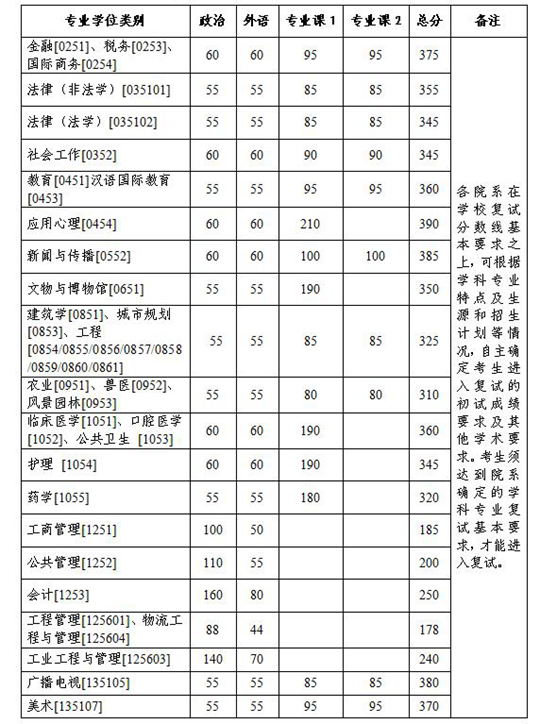 1.醫學院公共衛生、護理專業類別考生,滿分為100分的科目成績不低于50分,滿分為300分的科目成績不低于150分,總分成績不低于310分,可參加復試。