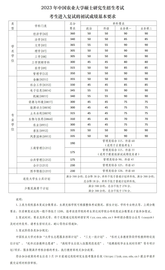 2023年中國農(nóng)業(yè)大學(xué)碩士研究生招生考試考生進(jìn)入復(fù)試的初試成績基本要求