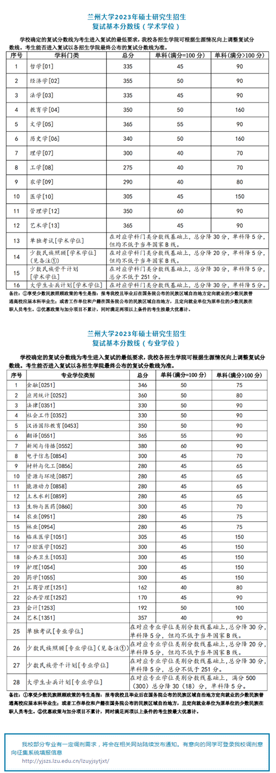 蘭州大學2023考研復試基本分數線公布