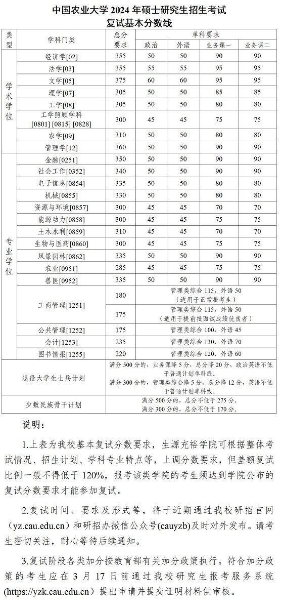 中國(guó)農(nóng)業(yè)大學(xué)2024年碩士研究生招生考試復(fù)試基本分?jǐn)?shù)線(xiàn)