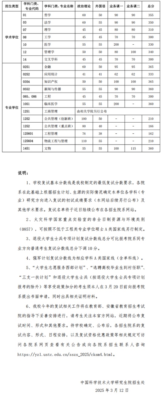中國科學技術大學2025年碩士研究生招生考試復試基本分數線