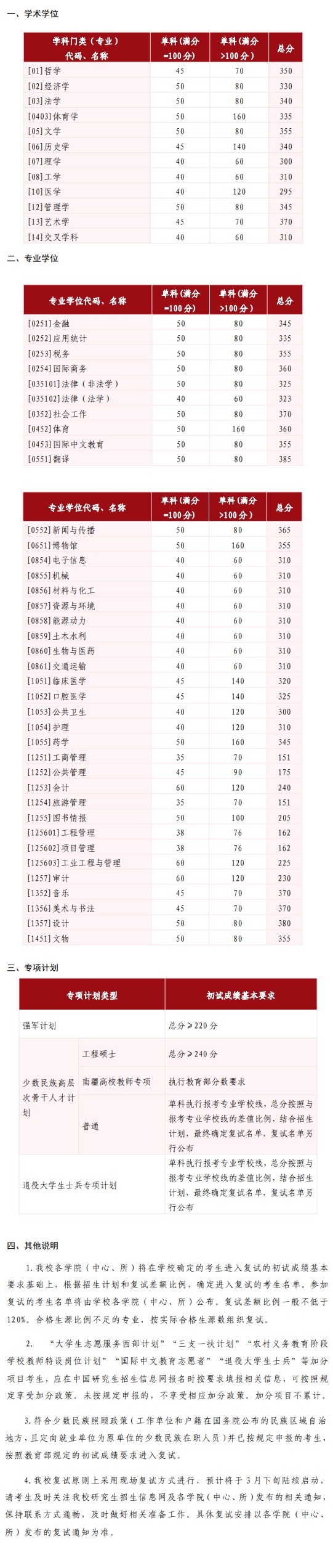 山東大學2025年碩士研究生招生考試考生進入復試的初試成績基本要求