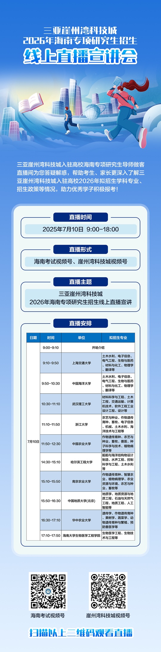 | 研考︱三亞崖州灣科技城2026年海南專項(xiàng)研究生招生線上直播宣講會(huì)預(yù)告 |