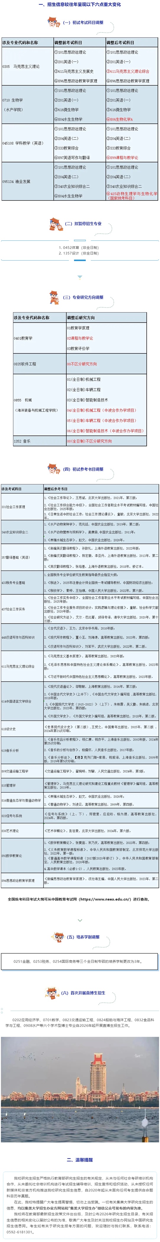 根據學校研究生招生專業學科發展和實際情況,我校部分招生專業2026年招生形式、考試科目、參考書目等將適當進行調整。為方便廣大有意向報考我校的考生開展備考相關工作,現將我校2026年研究生擬招生專業信息變化情況予以公布,供考生備考復習時參考。