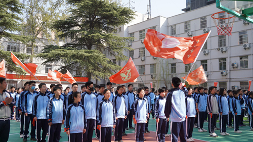 教師宣誓結(jié)束后,各班領(lǐng)誓員上臺(tái)領(lǐng)取本班班旗,與同學(xué)們一起緊握右拳高昂宣誓。