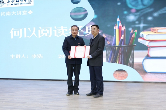 3月21日下午,西安翻譯學院文學與傳媒學院邀請教育部長江學者、西北大學中國文化研究中心主任、中國唐代文學學會會長李浩教授在終南大講堂作題為“何以閱讀經典”的學術講座。西安翻譯學院執行董事、校長崔智林出席,并為李浩教授頒發了西安翻譯學院特聘教授證書。西安翻譯學院文學與傳媒學院院長亢西民主持,李家寶教授等中國語言文學系教師與學生共享盛宴。