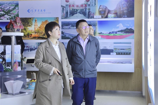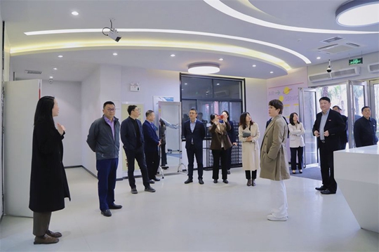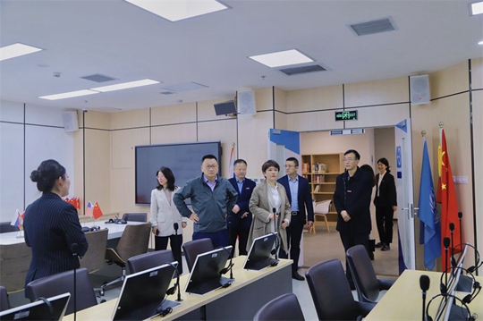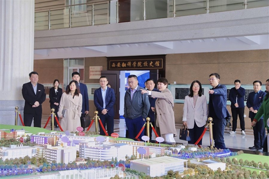 在學校沙盤前,丁晶向來賓們介紹了學校的整體布局。隨后,在丁晶等校領導的帶領下,胡建波一行實地參觀了西安翻譯學院校史館、國際商學院教學樓、文學與傳媒學院的空中乘務實訓中心和新媒體與表演藝術實踐教學中心、東區學生公寓、外國語言與文化實踐教學中心、同聲傳譯實驗室、人工智能實驗室等現代化的教育教學場所以及在建的國際會議中心。隨著參觀深入,來賓們驚嘆于西譯的發展變化以及學校近年來在育人環境、內涵建設、教育教學、人才培養等方面取得的輝煌成績。參觀中,兩校領導就學校基礎設施改造、未來發展規劃等進行了深入溝通。