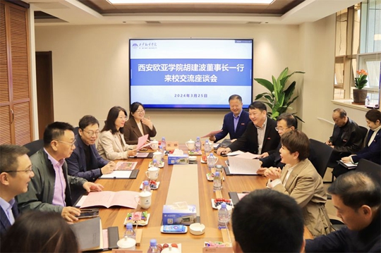 3月25日上午,西安歐亞學院董事長胡建波、副校長李正、副書記張軍宏、副校長張樂芳、教務處處長張娜、基建處處長雷春妮、后勤集團總經理助理強建旗一行到西安翻譯學院參觀交流,受到了西安翻譯學院董事長丁晶的熱情接待。