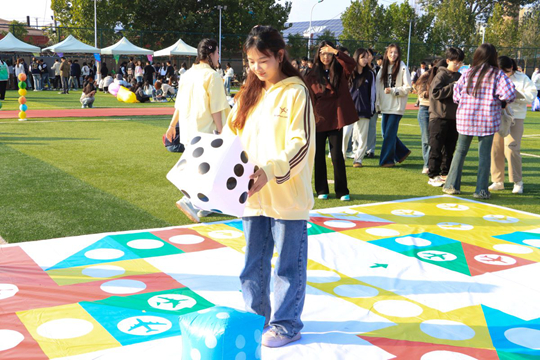 本次活動聯動各二級學院,精心構筑三大心理成長路徑,系統整合七大板塊內容,引領學生在沉浸式體驗中探索自我、滋養心靈。團隊協作區設有“合力建塔”“大型撲克牌”等項目,引導學生在溝通與配合中建立信任,從集體勝利中獲取深層歸屬感與快樂;思維挑戰區包含“智拼七巧板”“地面飛行棋”“大富翁”等智力比拼項目,激發學生在解決問題中迸發靈感,從突破自我中獲得成就與興奮;活力釋放區則通過“跳舞毯”“快樂抖球”“禮射”“沙包”等藝術與競技活動,鼓勵學生盡情舒展身心,在專注與律動中喚醒身體能量,在歡笑與挑戰中自然激活積極情緒,釋放多巴胺神經遞質,真正實現“在玩中學、在樂中長”。