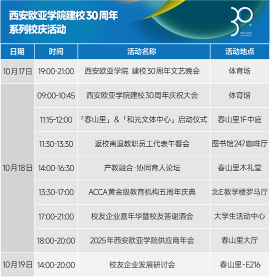 此外,西安歐亞學院建校30周年文藝晚會將率先點亮校慶的第一束光;返校離退教職員工代表午餐會向躬耕教育的教師致敬;供應商年會則彰顯與合作伙伴攜手共進、構建良性生態的誠意。
