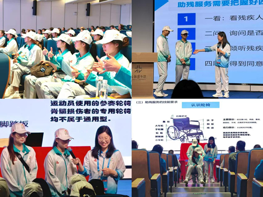 為更好地服務(wù)殘?zhí)貖W會,19名“小海豚”志愿者骨干參加助殘服務(wù)專項(xiàng)培訓(xùn)。他們學(xué)習(xí)了無障礙溝通技巧、輪椅推行規(guī)范、視障引導(dǎo)方法等專業(yè)知識,更在實(shí)踐中培養(yǎng)了細(xì)致入微的觀察力和同理心。培訓(xùn)結(jié)束后,志愿者骨干將所學(xué)內(nèi)容傳達(dá)給每一名“小海豚”志愿者,全力保障賽事順暢高效開展。