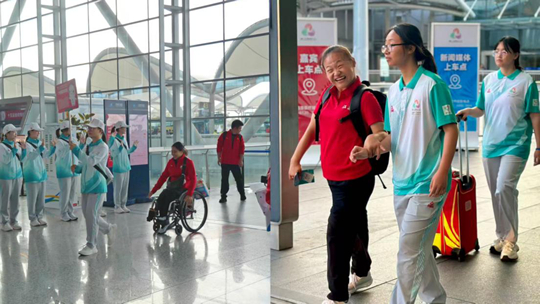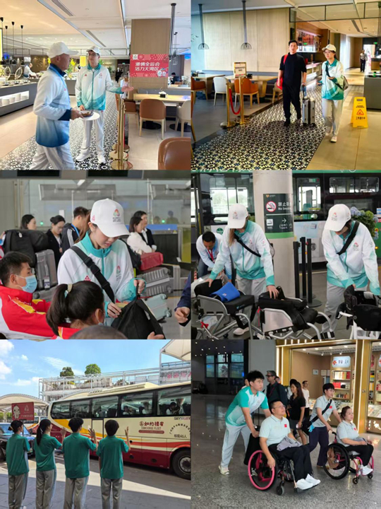 “小海豚”志愿者遵循“平等、尊重、適度、暖心、精準(zhǔn)、高效”原則,以伙伴、朋友的身份提供服務(wù),注重殘障人士的自主性與獨(dú)立性,營造暖心服務(wù)氛圍。在白云機(jī)場T1、T2、T3航站樓接機(jī)口,“小海豚”志愿者會提前核對殘障運(yùn)動員的航班信息,推著可折疊的無障礙行李車等候,為坐輪椅的運(yùn)動員搬運(yùn)行李并平穩(wěn)護(hù)送其通過特殊通道;遇到視力障礙的運(yùn)動員,志愿者會輕握對方的手腕引導(dǎo)其避開人群,還會提前告知前方路況。從最初志愿者問運(yùn)動員“您好,需要幫忙嗎?”到運(yùn)動員遇到問題主動問“志愿者,我的同伴需要去T1,能帶他去T1嗎?”這不僅僅是對志愿者服務(wù)的認(rèn)可,更是一份信任。