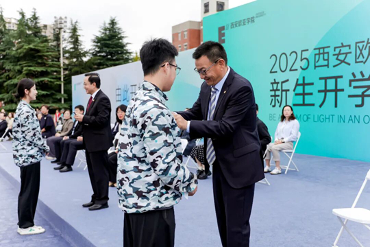 西安歐亞學院創辦人、董事長胡建波教授,西安歐亞學院黨委書記趙國華教授共同為新生佩戴校徽,頒發30周年限定版學生證。
