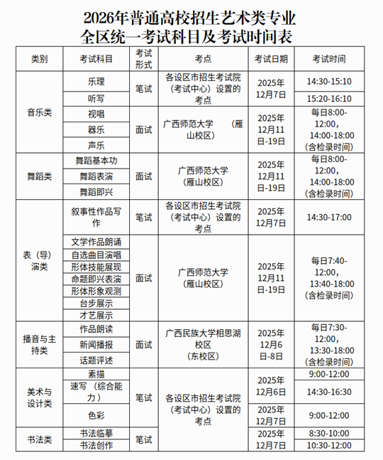2026年普通高校招生藝術(shù)類專業(yè)全區(qū)統(tǒng)一考試(以下簡稱全區(qū)藝術(shù)統(tǒng)考),設(shè)置音樂類、舞蹈類、表(導(dǎo))演類、播音與主持類、美術(shù)與設(shè)計類、書法類、戲曲類等7個考試類別,其中戲曲類采用省際聯(lián)考由相應(yīng)專業(yè)(劇種)的組考院校負責組織(另文公布),其余考試類別由我院組織,具體安排如下表: