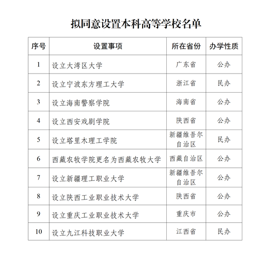 根據《中華人民共和國高等教育法》《普通高等學校設置暫行條例》《普通本科學校設置暫行規定》《本科層次職業學校設置標準(試行)》等有關規定以及第八屆全國高等學校設置評議委員會考察評議結果,經教育部黨組會議審議,擬同意設置大灣區大學等10所學校,現予公示。