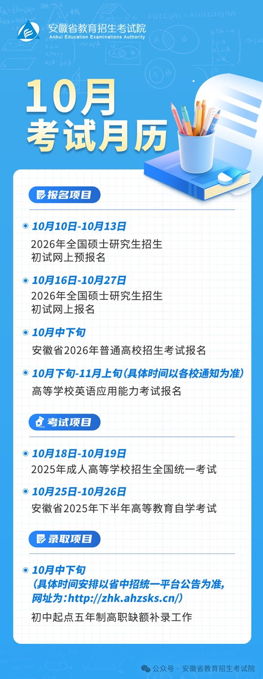 安徽省2025年10月教育招生考試月歷