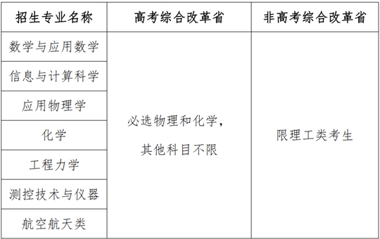 為全面貫徹全國(guó)教育大會(huì)精神,深入落實(shí)《國(guó)務(wù)院關(guān)于深化考試招生制度改革的實(shí)施意見》(國(guó)發(fā)〔2014〕35號(hào)),根據(jù)《關(guān)于在部分高校開展基礎(chǔ)學(xué)科招生改革試點(diǎn)工作的意見》(教學(xué)〔2020〕1號(hào))等文件,服務(wù)國(guó)家重大戰(zhàn)略需求,加強(qiáng)基礎(chǔ)學(xué)科拔尖創(chuàng)新人才選拔培養(yǎng),經(jīng)批準(zhǔn),我校自2020年起開展基礎(chǔ)學(xué)科招生改革試點(diǎn)工作(也稱“強(qiáng)基計(jì)劃”),探索多維度考核評(píng)價(jià)模式,選拔一批有志向、有興趣、有天賦的青年學(xué)生,培養(yǎng)具有空天報(bào)國(guó)情懷、扎實(shí)數(shù)理基礎(chǔ)、科學(xué)創(chuàng)新能力、全球視野格局的高素質(zhì)拔尖創(chuàng)新人才,為國(guó)家重大戰(zhàn)略領(lǐng)域輸送后備人才。